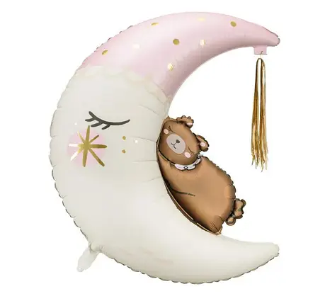 Ведмедик на місяці рожевому — яскрава кулька, яка неодмінно приверне увагу. Ця двостороння прикраса створює настрій. Додайте її до композиції з іншими кульками або використовуйте як акцентний елемент.