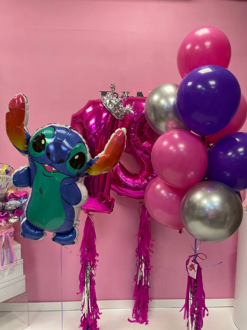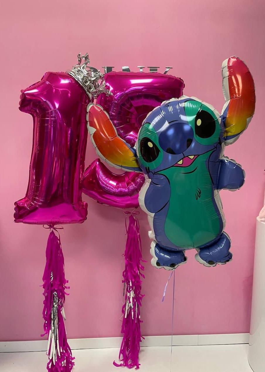 У наборі ви знайдете фольговану фігуру Стіча, яка привнесе веселий та кумедний акцент, а також величезні фольговані цифри "17" у яскравому кольорі фуксія висотою 100 см, що стане центром уваги на святі. Срібна корона, що прикрашає цифру 1, додасть святковості та королівського блиску, підкреслюючи важливість цього моменту.