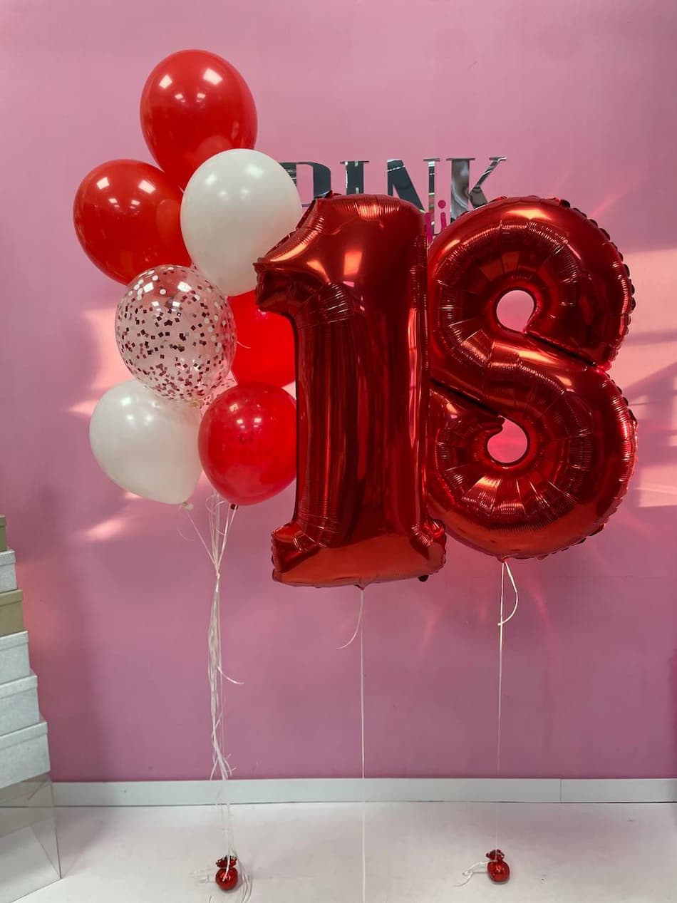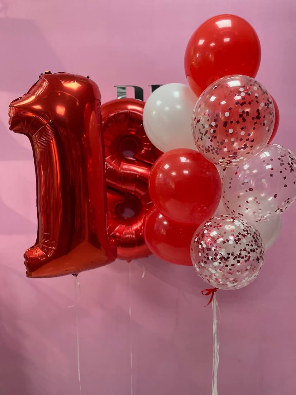 Червоні фольговані кулі з цифрою "18" заввишки 100 см надають святкової урочистості, підкреслюючи важливість моменту, а їхня величезна висота точно приверне увагу всіх присутніх.